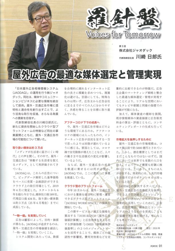 サイン・ディスプレイ専門誌「POP EYE(2025年12月15日号)羅針盤」に、当社社長 川崎日郎のインタビューが掲載されました。JAODAQの新たな事業展開、今後に向けての方向性、これからの屋外・交通広告市場の可能性などが掲載されておりますので是非ご覧ください。